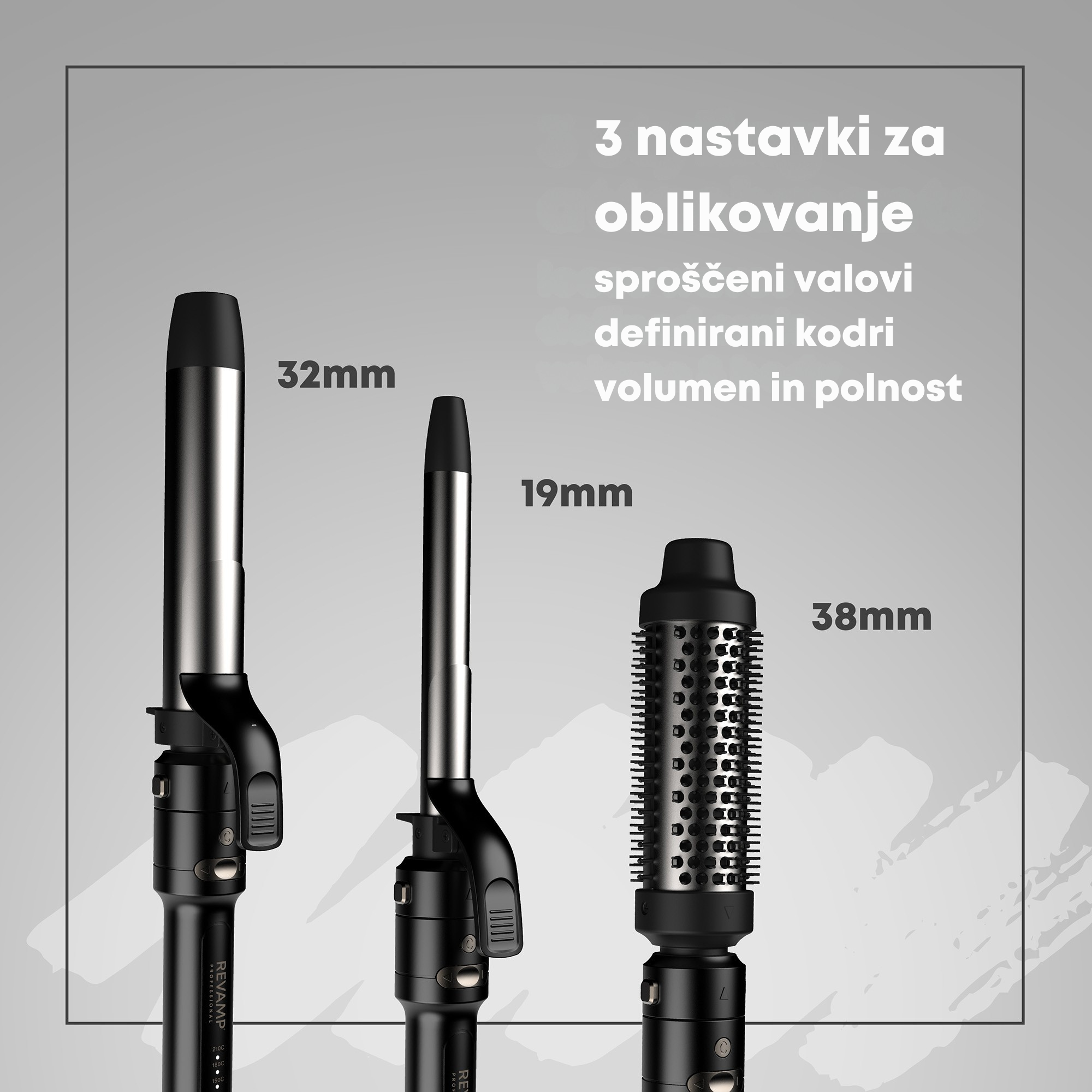 - 3 zamenljivi nastavki: 38 mm okrogla krtača / 32 mm kodralnik / 19 mm kodralnik