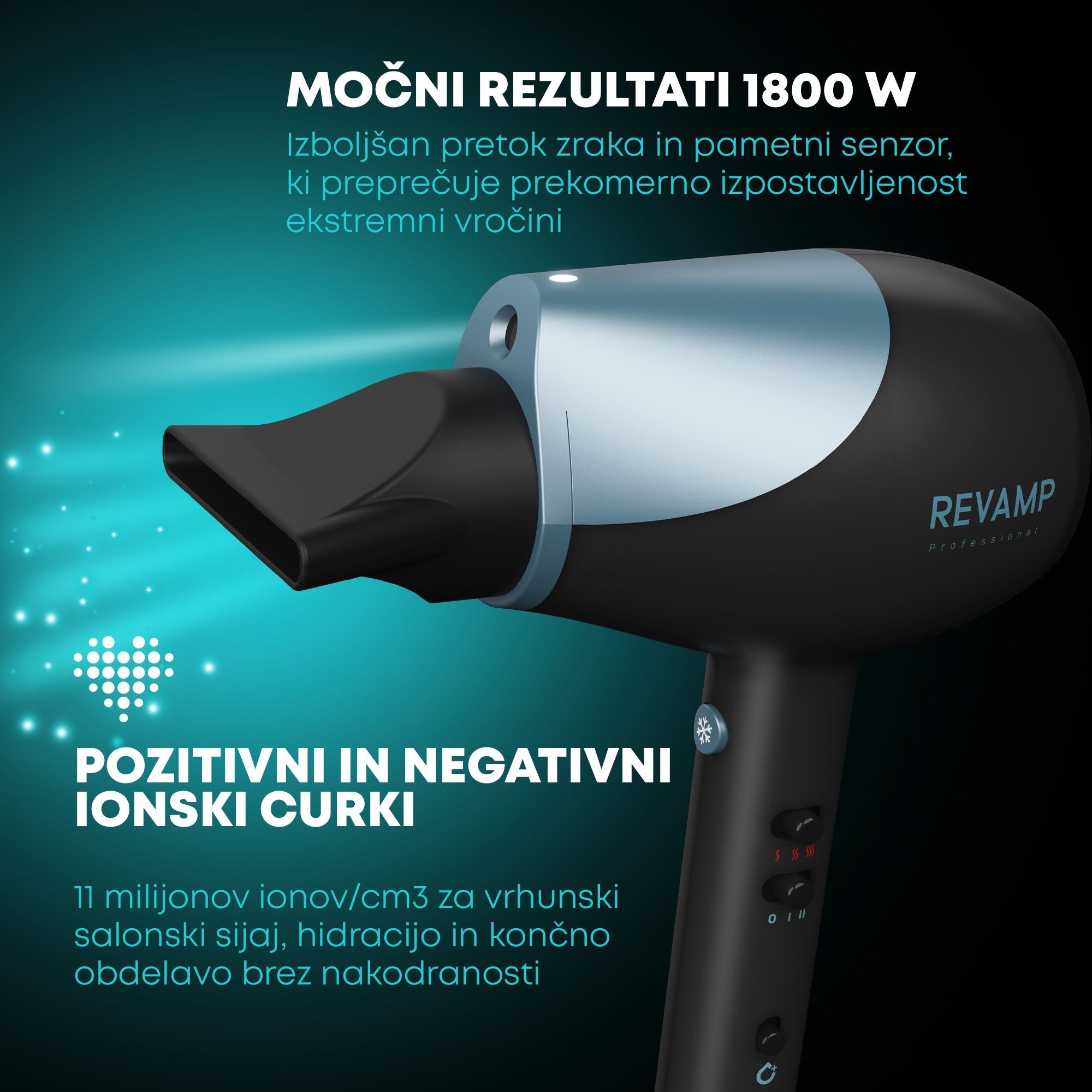 Poskrbite za svoje lase in zamenjajte sušilnik za lase z Revamp Progloss™ Hydro Shield X Shine sušilnikom za lase. Ta sušilec za lase je inovativna dopolnitev linije Revamp, katerega bistvo je skrb za lase. Sušilnik je opremljen s pametnim senzorjem, ki spremlja temperaturo zračnega toka, in po potrebi prilagaja toploto, da prepreči nepotrebne poškodbe in hkrati ščiti naravno vlago las. Precej intelegentno, če lahko tako rečemo - vendar se napredna tehnologija ne zaključi pri tem. Ta sušilnik za lase ima pozitivne in negativne ionske tokove, zato bo poskrbel, da se lasje med oblikovanjem ne bodo razmršeni, saj bo poskrbel za njihovo nego. S štirimi nastavitvami toplote in tremi nastavitvami hitrosti (vključno s hladnim načinom) lahko popolnoma nadzorujete sušenje in oblikovanje. Rešetka, prepojena s Progloss™ tretmajem keratina, arganovega in kokosovega olja, obljublja gladke, sijajne in bleščeče lase, ki si jih boste želeli vedno znova. Ta sušilnik za lase ima dve koncentrirni šobi, difuzor za lepše oblikovane kodre, in snemljiv zadnji filter, ki ga je mogoče enostavno očistiti.