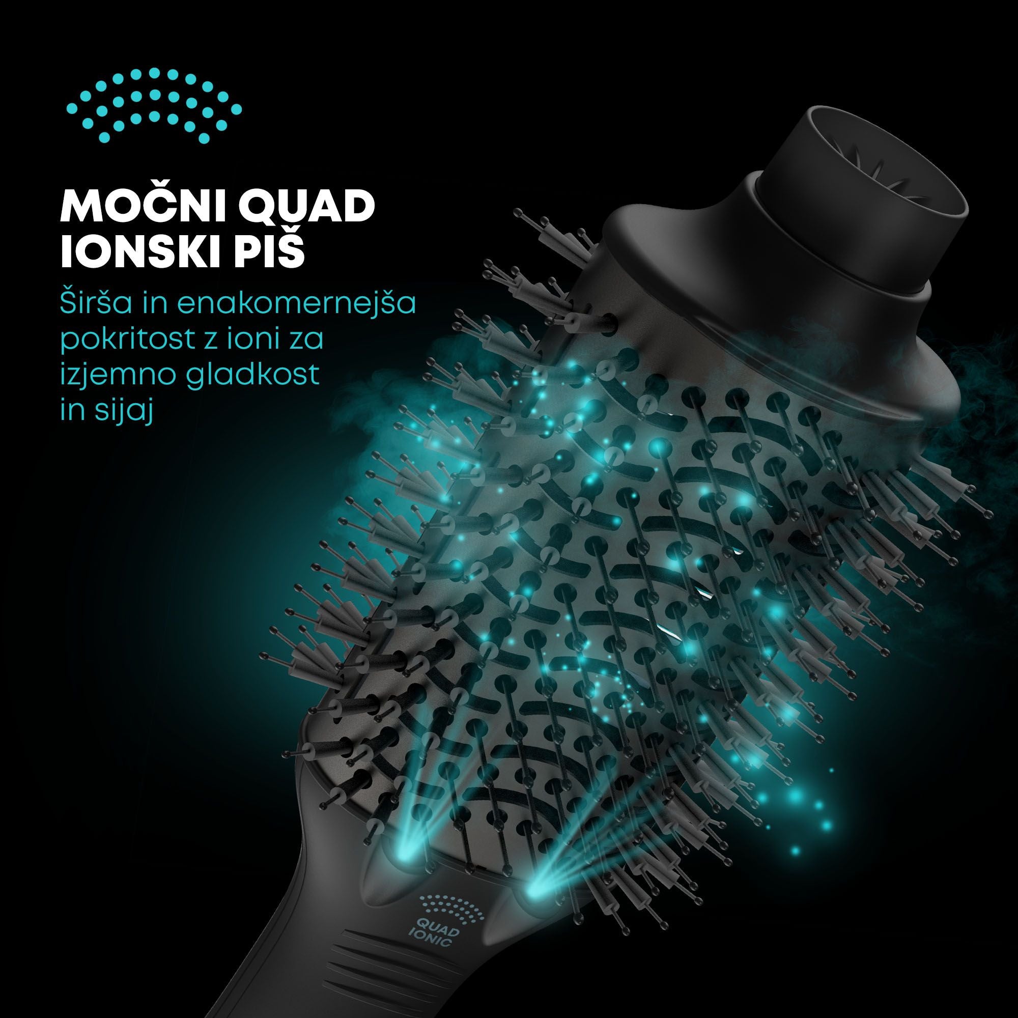 - Oblikovalec las za sušenje, glajenje, razčesavanje in volumen z močjo 1200 W z edinstvenim štirikratnim ionizirajočim sistemom pri sušenju ne ustvarja statične elektrike, sproščujoči se ioni preprečijo štrljenje las in jih zgladijo ter okrepijo sijaj.